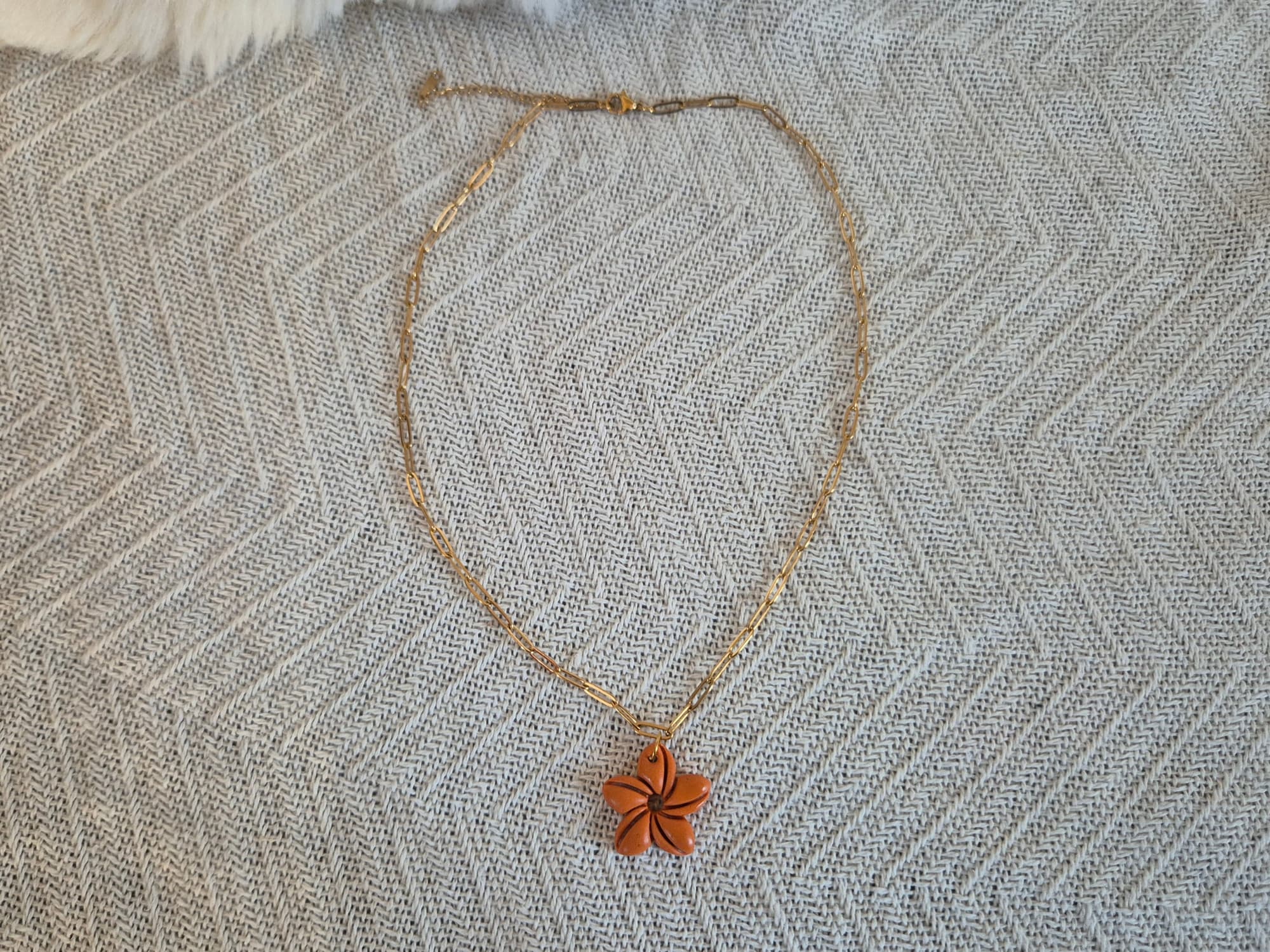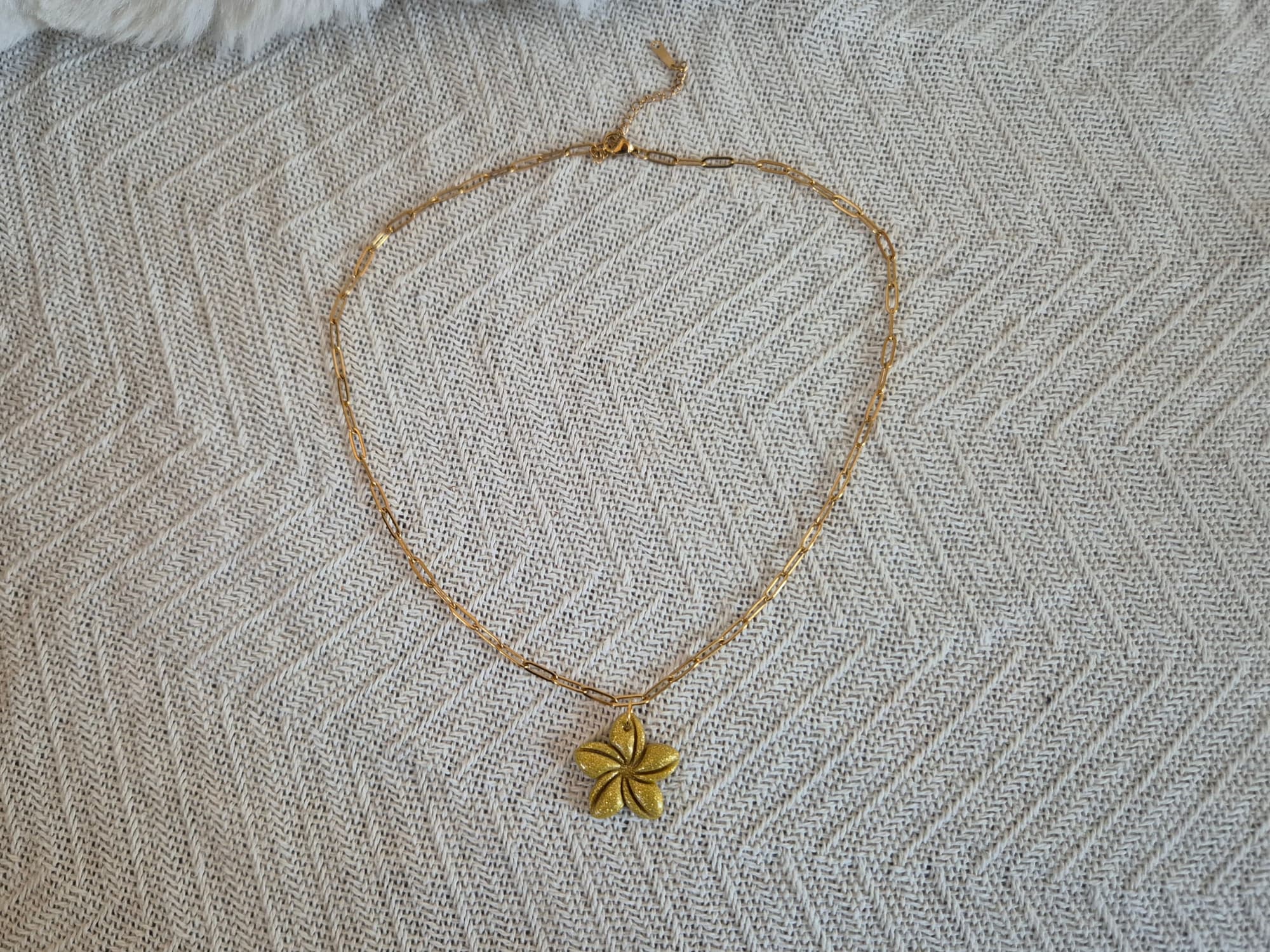 Son pendentif en forme de fleur apporte une petite touche de couleur, tout en restant discret.