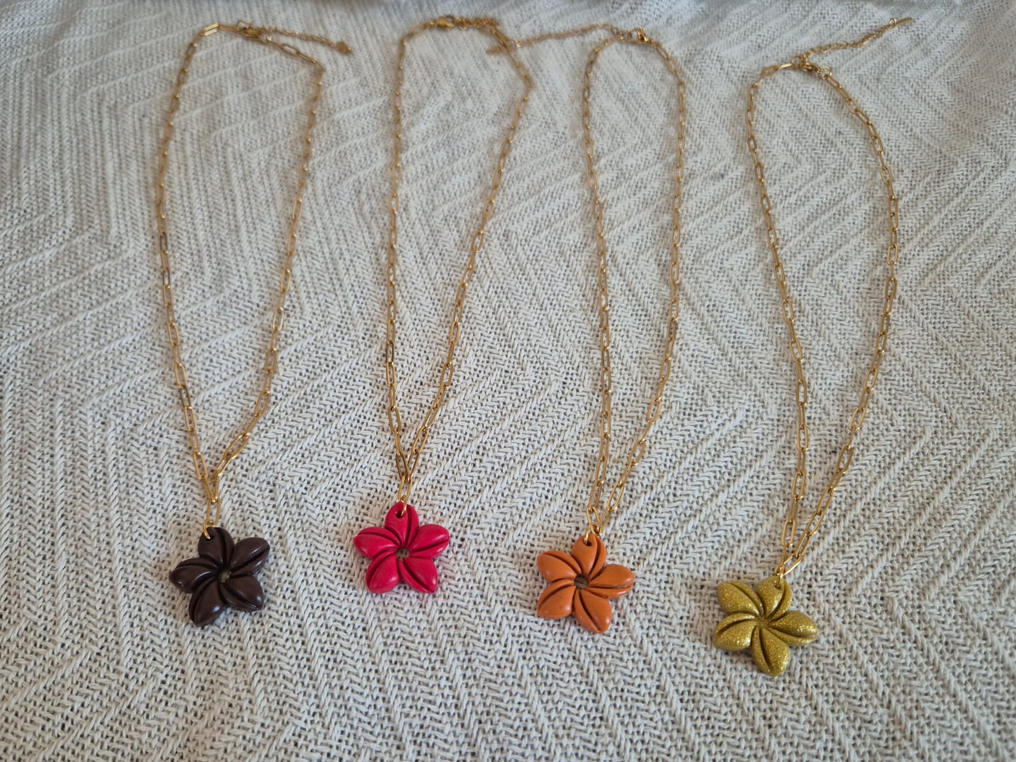 Chaque pendentif est façonné à la main en argile polymère, puis verni pour un rendu légèrement brillant.